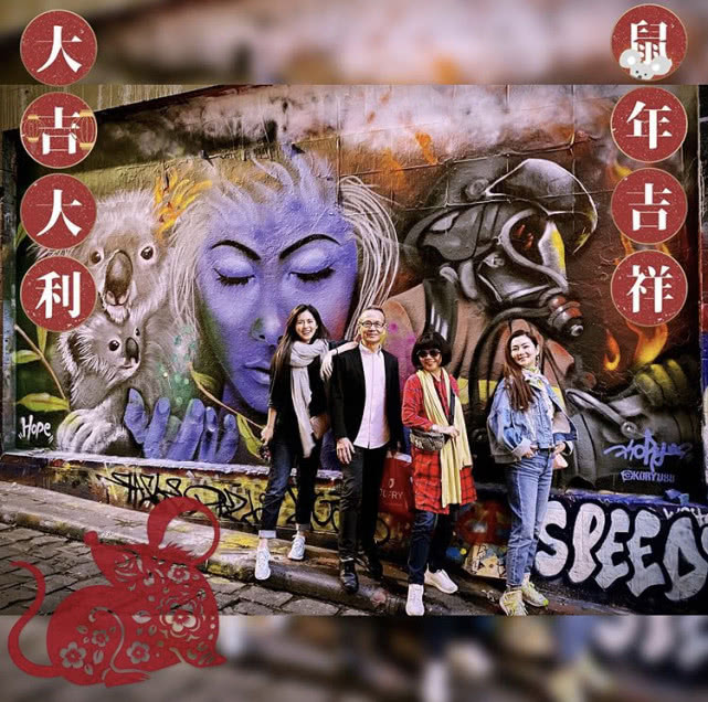 洪金宝与大儿子洪天明以及两个孙子一同合影,儿子跟孙子都不像洪金宝,而随了他的韩国前妻,单眼皮十分明显。