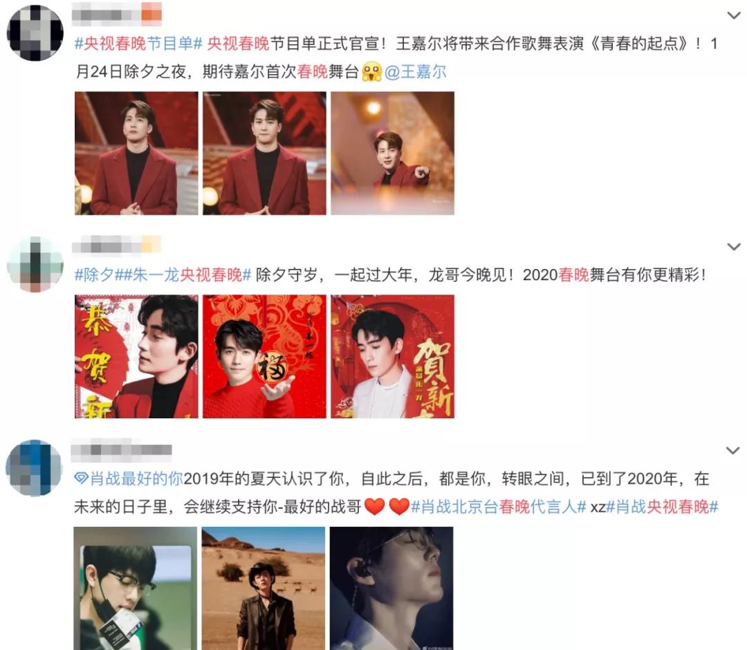 如果微博搜索央视春晚,大部分相关内容都与参与彩排的流量明星有关。除了新闻报道,粉丝打call占据了很大篇幅。“不管最后能不能上,受邀即肯定”“期待xxx的舞台”等等言论成为经常见到的语句。带着偶像与春晚的话题,再加上以往作品,或是文采奕奕的夸奖“小作文”,宣传、安利、表白两不误。