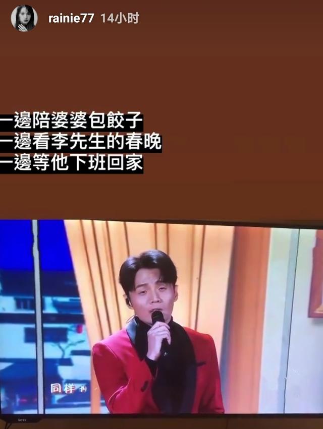 杨丞琳还用手机拍下了春晚表演中的李荣浩,并幸福地表示:一边陪婆婆包饺子,一边看李先生的春晚,一边等他下班回家!