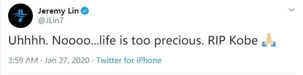 林书豪难以置信地发文:“哦,不,生命太需要珍惜了。逝者安息,科比。R.I.P.”