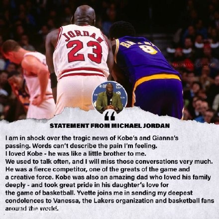 同样是篮球巨星,科比的前辈乔丹表示:“我对于科比和Gianna遇难的消息感到极度震惊。根本无法用言语表达我自己的悲伤难过之情。我爱科比,他就像是我的小弟弟一样。我们经常一起聊天,我真的很怀念我们当时一起聊天的时光。科比是一个强有力的竞争者,他是篮球运动最伟大的球员之一并且极具创造力。同样,他还是一个令人惊叹的父亲,他深深地热爱他的家庭,支持她女儿对于篮球的热爱。希望能够将我这最深切的慰问带给瓦妮莎、湖人全队以及全世界的湖人球迷。”