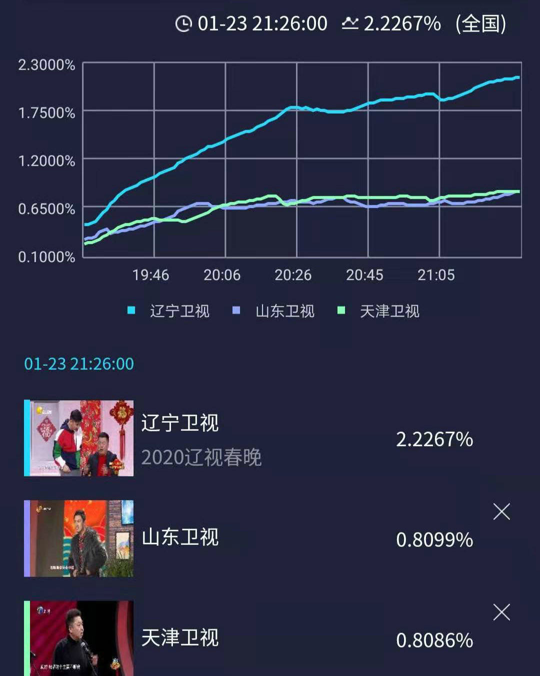 而这一问题,也出现在今年的天津卫视春晚收视率数据上。1月23日,辽宁卫视、山东卫视、江西卫视和天津卫视播出春晚内容。天津卫视实现相声专场,全部德云社演员,郭德纲和于谦老师更是压轴登台。不少德云社粉丝狂欢,认为这档春晚将实现收视率的爆棚。不过,真实的数据显示,天津卫视的实时收视率,不足辽宁卫视的半数。