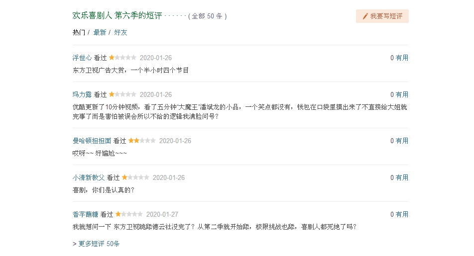 而刚刚首播的第六季首期,在豆瓣的观众口碑,则处于明显的两极分化当中。不少观众对于首期内容表示不满,给出一星两星的差评。也有观众对郭阳郭亮和宋宁的小品给出了五星好评,认为他们满满的正能量。与此同时,也有观众并未给出打分,说自己只看了十分钟,觉得是浪费时间等等。