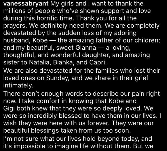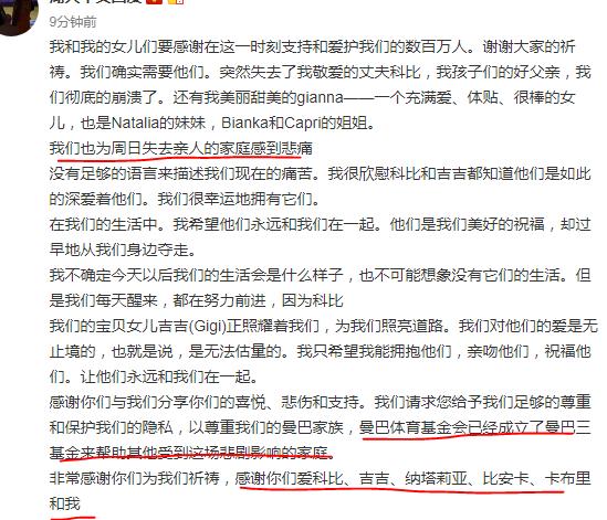 瓦妮莎在社媒长文中大概说了三个方面的事情。首先,她感谢支持和爱护自己家庭的数百万人,感谢大家的祈祷;第二,科比和吉安娜的去世,对自己打击很大,失去了敬爱的丈夫,孩子的好父亲和美丽甜美的吉安娜,没有语言能表达现在的痛苦,但是为了科比,自己要努力前进;第三,自己也为其他失去亲人的家庭感到悲痛,曼巴体育基金会已经成立曼巴三基金来帮助其他受到这场悲剧影响的家庭。