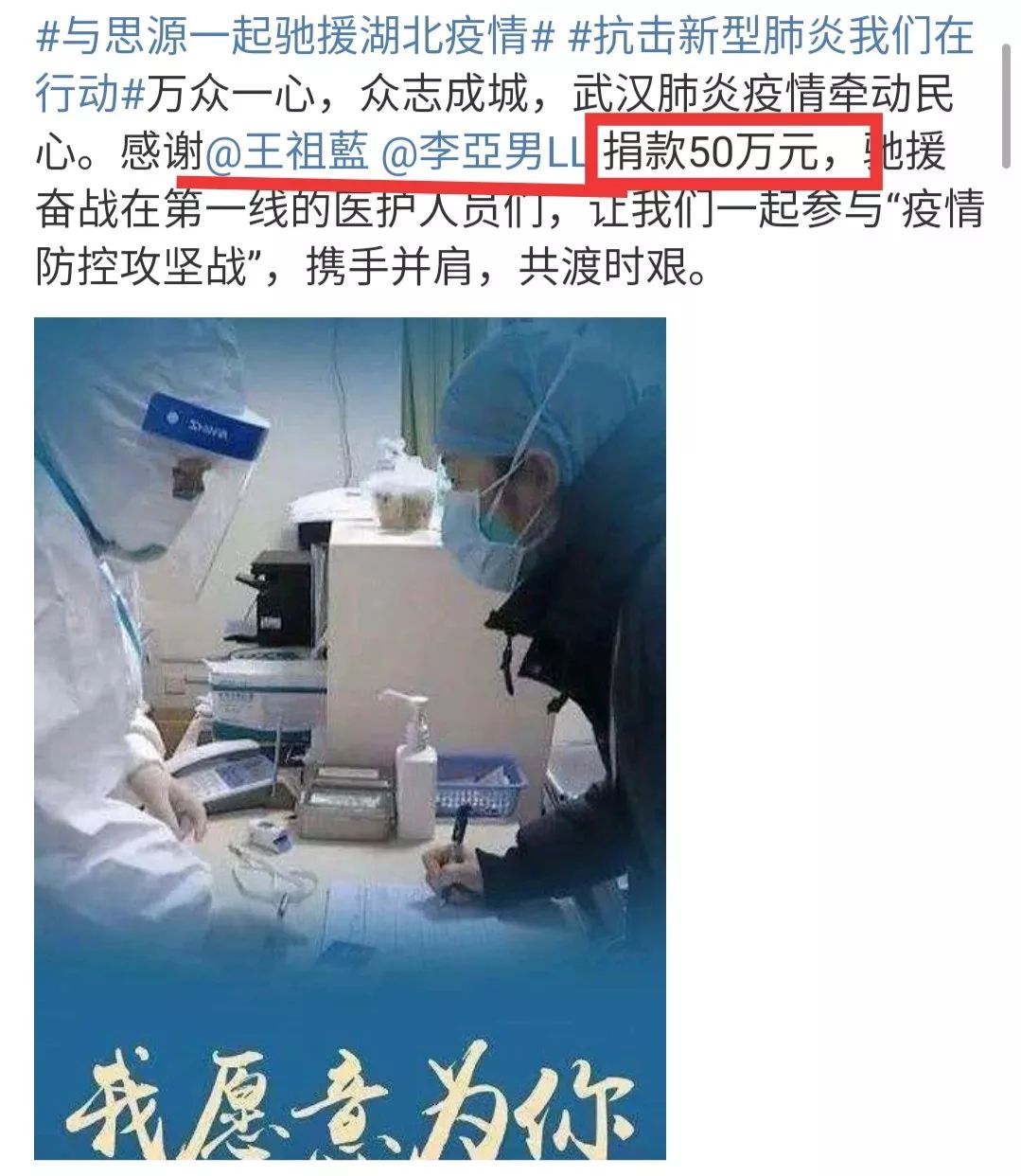 王祖蓝李亚男夫妇捐款50万元