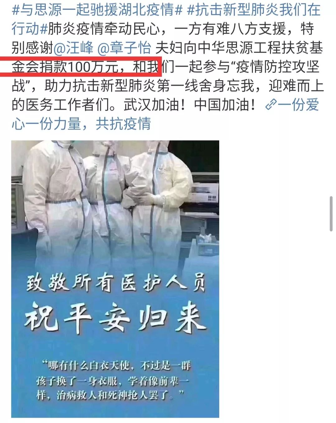 章子怡汪峰夫妇捐款100万元