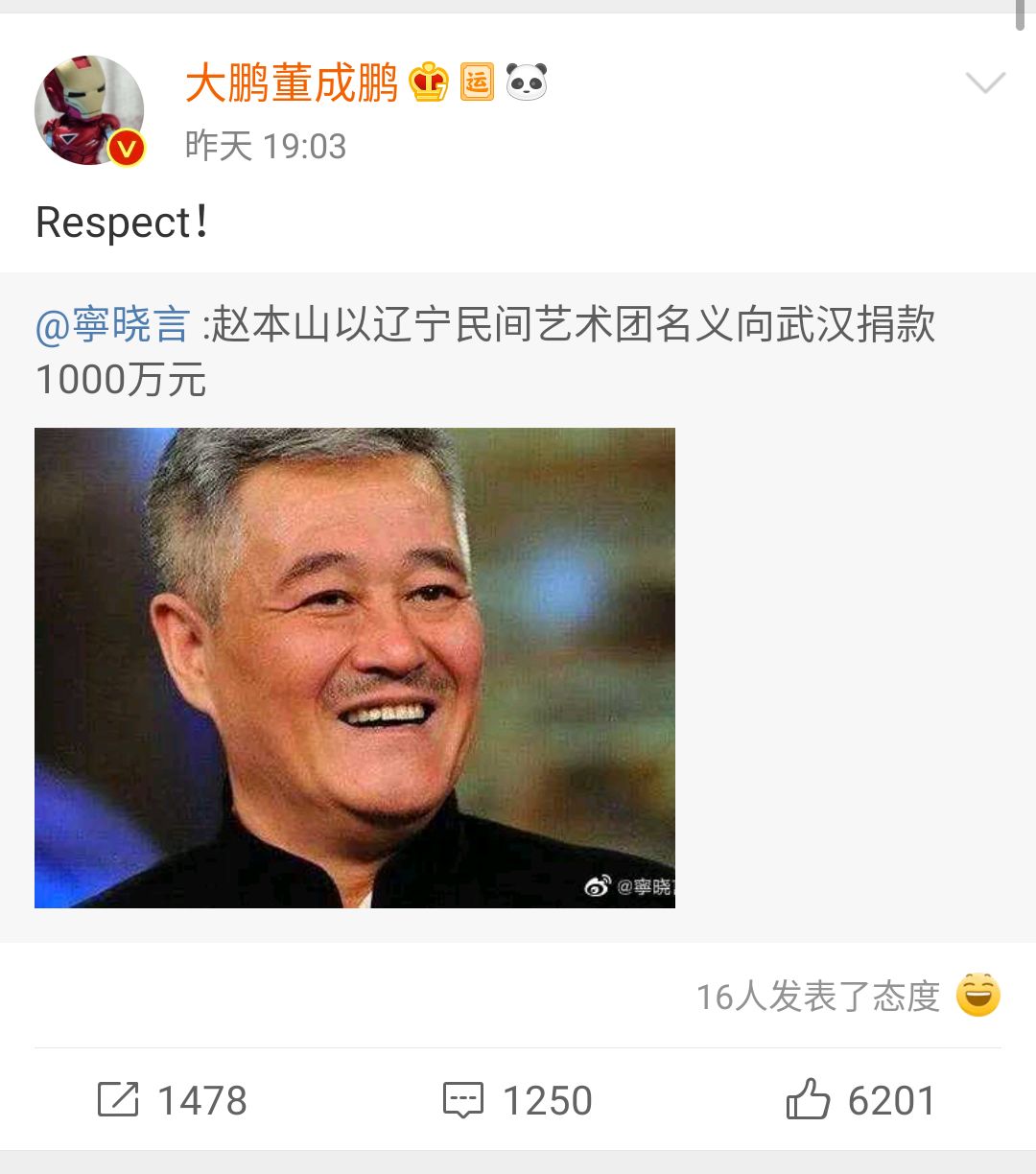 不得不说作为一名老艺人本山老师大方果断的作风着实让人敬佩,本次本山大叔捐赠的极为低调,在捐赠过程中并要求工作人员尽快打到武汉市慈善总会有关的账上,这一举动十分让人感动,徒弟大鹏也是转发此消息并配文“Respect”,63岁的本山大叔应该被记住!