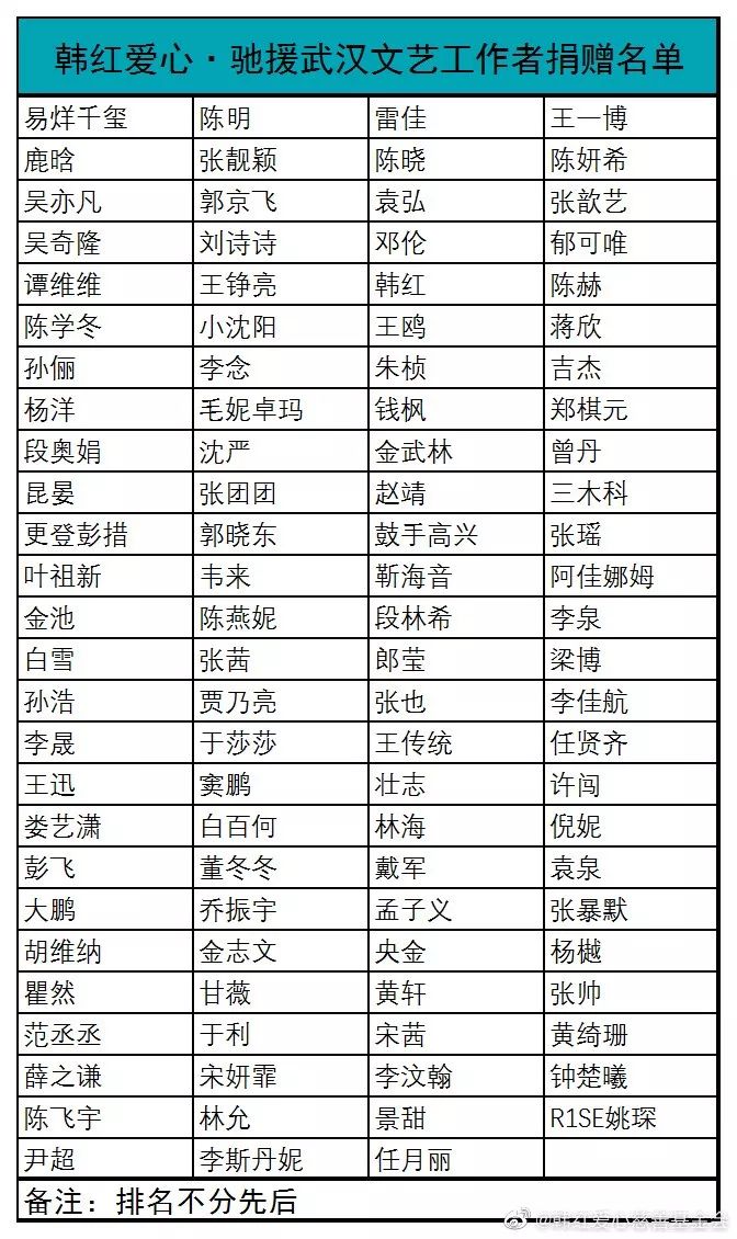 在这不得不提的就是韩红老师,对于公益事业韩红老师永远冲在前面,因为韩红老师多年来一直走在公益一线,而且亲力亲为为灾区踏踏实实地做贡献,所以娱乐圈里很多明星都非常信赖韩红。面对疫情韩红老师召集圈内好友纷纷向武汉伸出援手,大家也愿意通过韩红来捐赠,韩红在26日晒出捐赠的人名单,易烊千玺、王一博、范丞丞、孙俪、鹿晗、张靓颖、大鹏、杨洋、蒋欣、郁可唯等103位明星的捐赠。