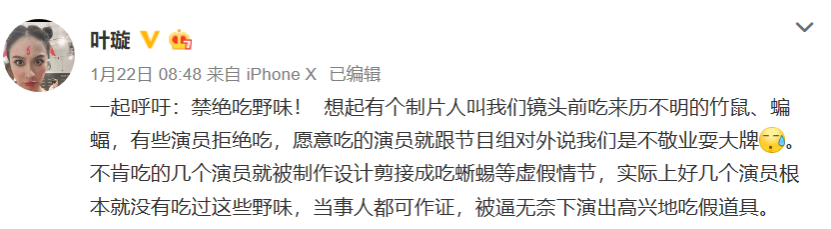 叶璇还自曝,有一次录制节目时被逼着吃来历不明的竹鼠、蝙蝠等野味。拒绝吃的演员就会被说是在耍大牌、不敬业,还会被剪辑出虚假情节。