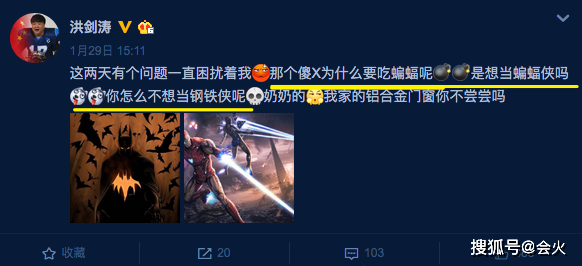 1月29日,演员洪剑涛在个人社交平台上罕见发文爆粗口,骂吃蝙蝠的人是傻X,称吃蝙蝠的人是想变成蝙蝠侠吗?我家的门窗你想不想尝尝!