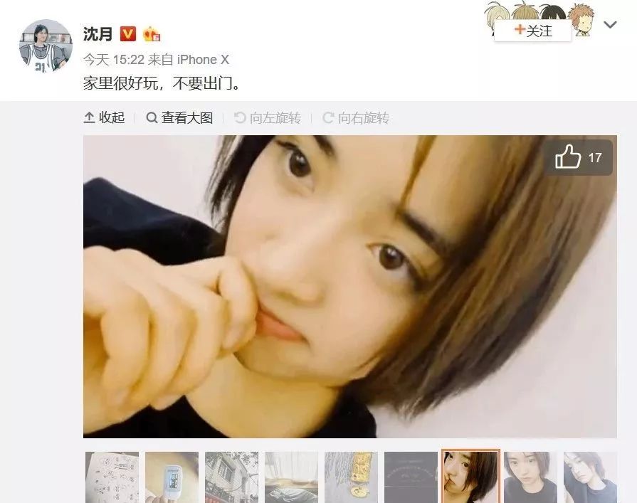 在杨幂发起了微博“无聊”接龙后,很多明星也晒出了自己在家的处境,沈月也为此发出自拍。