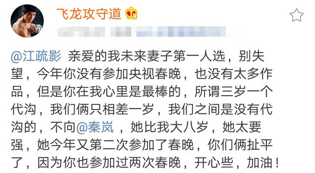 随即,飞龙又对自己的梦中情人江疏影隔空示爱:“江疏影,亲爱的我未来妻子第一人选,别失望,今年你没有参加央视春晚,也没有太多作品,但是你在我心里是最棒的,所谓三岁一个代沟,我们俩只相差一岁,我们之间是没有代沟的,不像秦岚 ,她比我大八岁,她太要强,她今年又第二次参加了春晚,你们俩扯平了,因为你也参加过两次春晚,开心些,加油!”