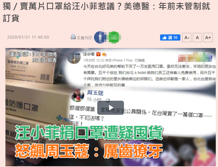 其实,周玉蔻与S帮姐妹结仇已久,包括前几天汪小菲为武汉捐助一万个口罩的时候,周玉蔻就曾在社交平台上发声,她认为在台湾口罩限购的状况下,汪小菲一口气拿到1万个口罩,貌似有些奇怪,质疑有囤积嫌疑:“大S的先生送1万个口罩,合法吗?是不是囤积来的?别人只能买3个,他们1万个怎么来的?”
