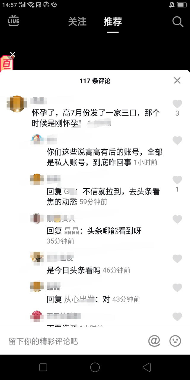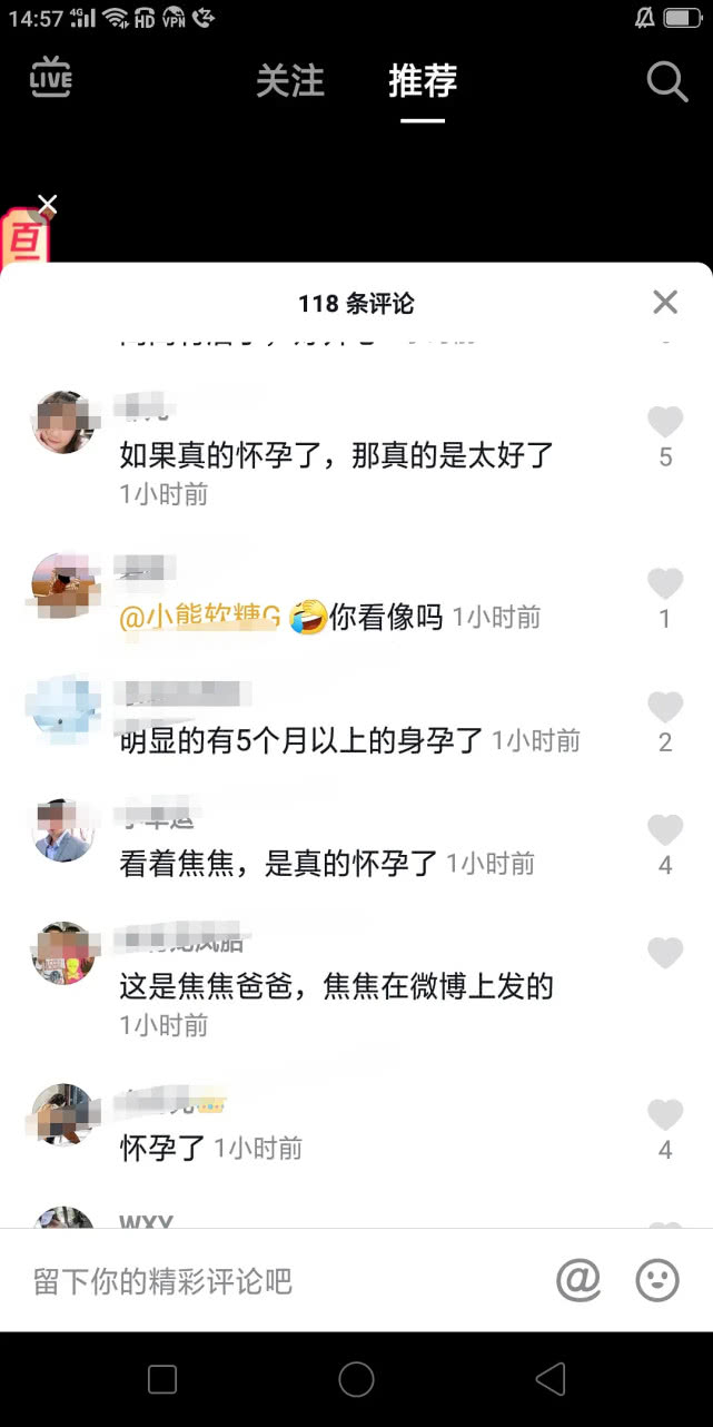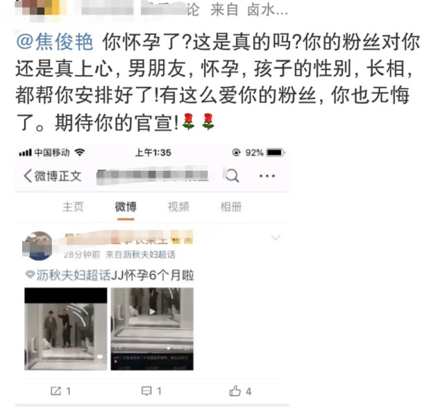 在该粉丝发文后,有多事的粉丝还把视频转到了其他地方,双管齐下,粉丝们对焦俊艳怀孕的消息也是深信不疑。尤其在评论区你来我往的猜测了起来,更有粉丝表示“看着焦焦是真的怀孕了,明显有五个月以上的身孕了”。因为“焦俊艳怀孕”的第一消息是在CP超话里发的,因此在评论区大多都是焦俊艳和高以翔CP粉的留言。甚至有粉丝按照毫无逻辑的时间推测说出了“高高有后了”这样荒唐的话,好像为了证明自己的推断是正确的,CP粉还以高以翔身前的微博大做文章。