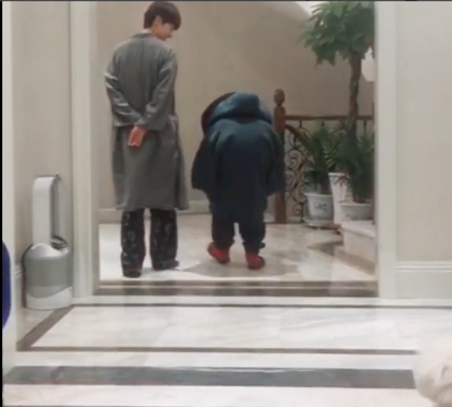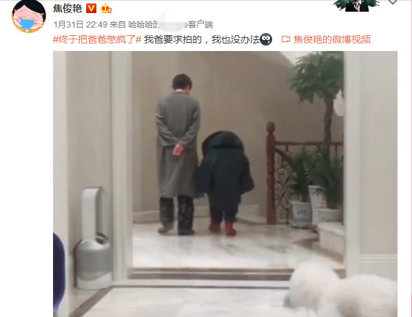 1月31日,焦俊艳在社交平台上发布了短视频。视频中,焦俊艳穿着灰色休闲睡衣看上去十分随意,大概是闲的发霉,父女俩为了打发时间拍着之前最流行“装小孩子”的视频。或许是因为待在家里,焦俊艳的造型比较随性有点不修边幅,宽大的睡衣在侧面看来更显的有些臃肿。
