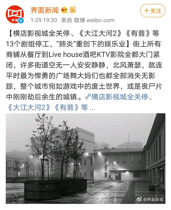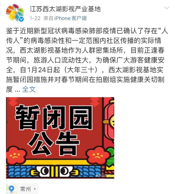 此外,还有网友发现常州影视基地的官方微博,早在1月22号当天就发布了闭园通知,从这点来看,基本上也可以确定《亲爱的戎装》剧组确实还在拍摄,但基本上所有工作人员都已经避免了被感染的可能性。