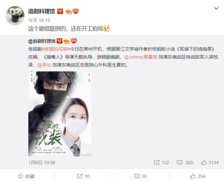 2月1日下午,某位影视大V博主在微博爆料,他转发电视剧《亲爱的戎装》开机时的微博并表示:“这个剧组挺拼的,还在开工拍戏”