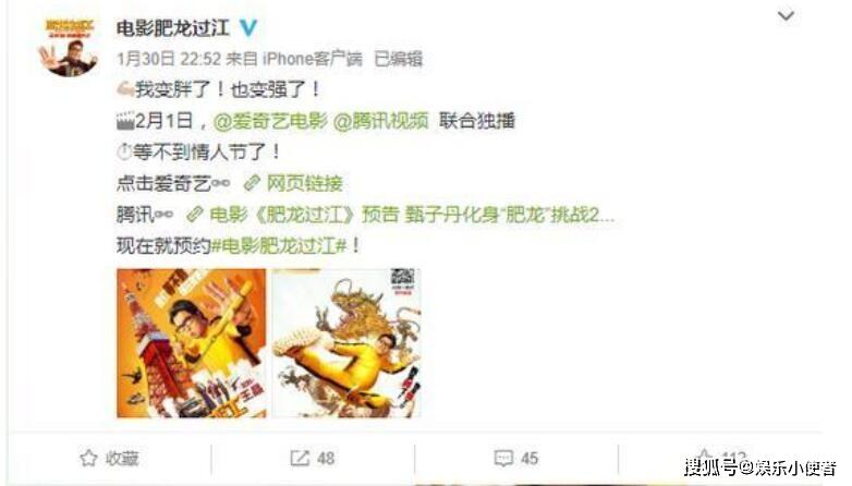 据悉,甄子丹为了饰演这部电影痴情胖子的形象,他的特效增肥到250斤但比叶问更能打,更幽默!”这也是继《囧妈》之后,又一部新片在网上开播,甄子丹主演的《肥龙过江》原定2月14日上映,现在提档至2月1日在网络播出。