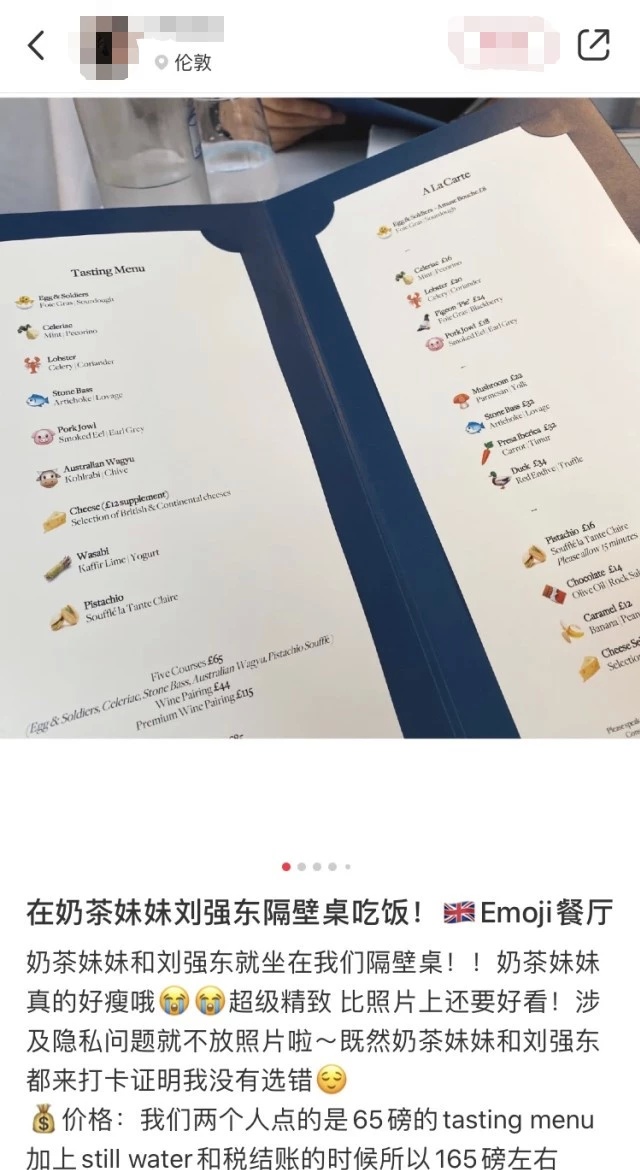 不过该网友并没有公开小天和刘强东的照片,只发了食物和菜单图。