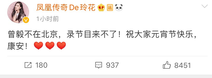 曾毅是湖南人,玲花发文爆料,称曾毅不在北京,录节目来不了,祝大家元宵节快乐,康安!没有说曾毅去哪儿了,可能因为疫情来不了录节目,因为大家都呆在家里,最好不要出来走动,可能曾毅无法回到北京录节目,所以只能玲花和其他歌手搭档了。