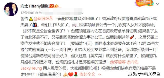 儿子、儿媳心态良好,对此不以为意,但作为妈妈和婆婆的向太陈岚就坐不住了。今日下午,向太在微博发文怒怼网友:“警告,微博下面的吃瓜群众别瞎BB了!”此外,向太还表示两人工作很忙,而且香港领证要公告一个月没有人反对才能领证,结果这一个月过去之后,又因为某些政策没有处理好,再然后就是疫情来了,亲朋好友不能出席,小两口就将国内婚礼的日子延期了。