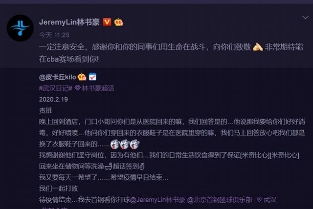 20日中午,林书豪在社交媒体上为她点赞,并与对方相约CBA赛场见,“一定注意安全,感谢你和你的同事们用生命在战斗,向你们致敬,非常期待能在cba赛场看到你!”