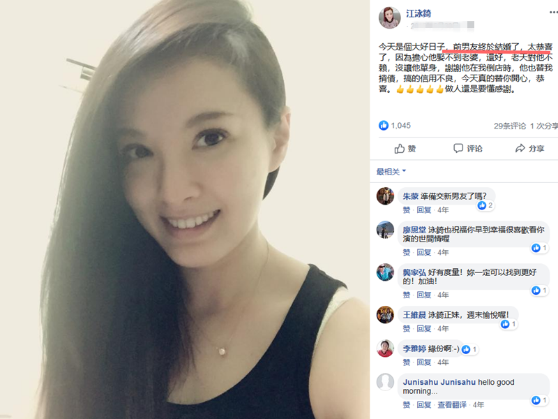 而除了事业做得好之外,平时身处的环境也让其性格相当不错,之前,在前男友结婚当天,她就大方发文祝福:今天是个大好日子,前男友终于结婚了,太恭喜了,因为担心他娶不到老婆,还好,老天对他不赖,没让他单身,谢谢他在我倒店时,他也替我背债,搞的信用不良,今天真的替你开心,恭喜。做人还是要懂感谢。