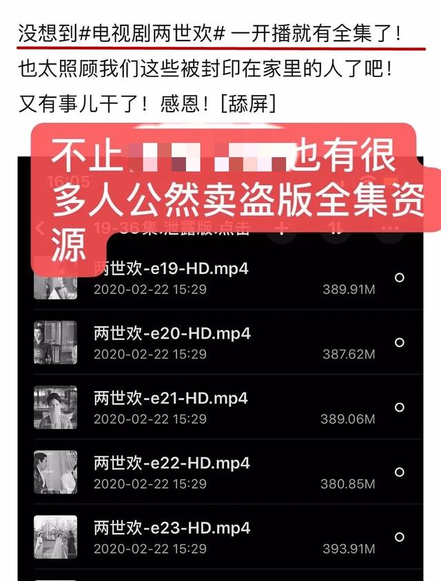 可是在开播不到24小时之后,《两世欢》就遭遇了片源泄露的事件。很多网友表示,自己朋友圈微商全在免费发送《两世欢》全集链接,泄露出来的正片是黑白版,而且主要是19-36集。而目前泄露《两世欢》的平台方很多,事情已经到了持续发酵的阶段。