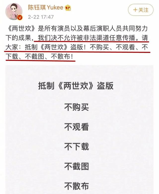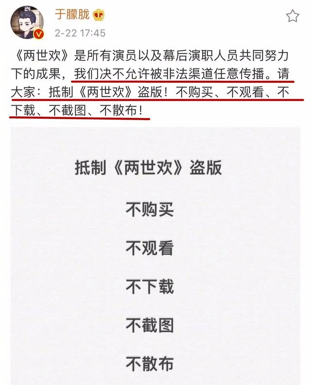 新剧刚开播仅1天,两位主演纷纷发博,表示《两世欢》是全剧组工作人员共同努力的成果,坚决抵制盗版、盗录,决不允许非法渠道和随意传播,支持正版!
