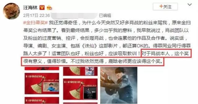 汪海林也发博感慨虽然肖战得这个奖很有意义,但是他依然觉得颁给鹿晗会更好,可见很大程度上没有做到“实至名归”。