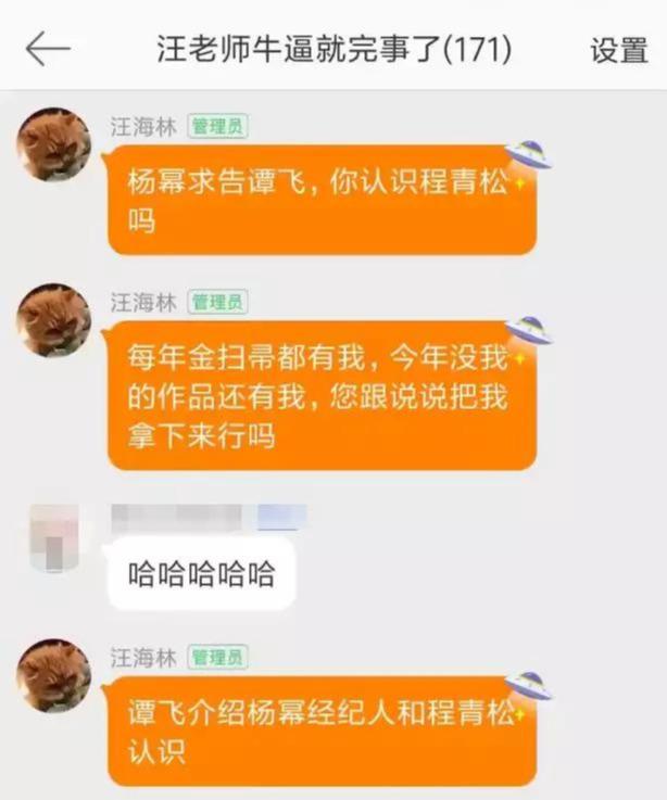 而这个消息的来源则是知名编剧汪海林在自家铁粉群中曝出的,他用杨幂举例称曾经杨幂因为每年都得金扫帚奖,就通过谭飞的关系认识了金扫帚奖的创办人、《青年电影手册》主编程青松。