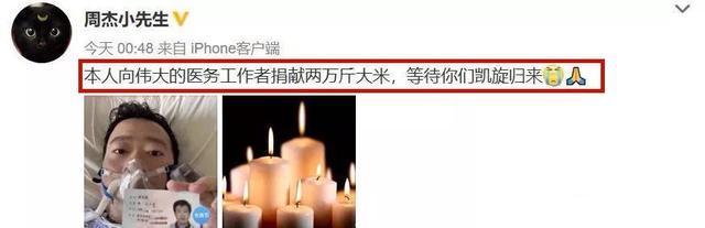 现在的周杰其实已经很久没有在娱乐圈露脸了,网络上最近一次出现他的名字,还是在2月7日那一天,因为李文亮医生的离世,让每个人心中无限的惋惜,同样难过的周杰,就在那一天发文,决定要向医护人员捐出20000斤大米,以期待他们从前线凯旋。