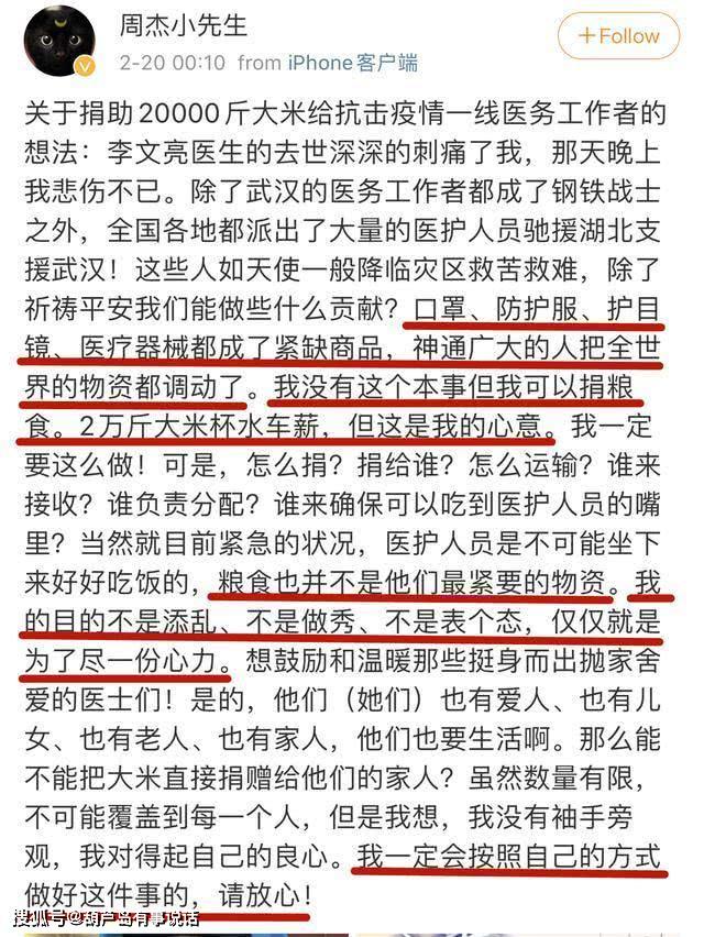 周杰的解释如同他捐大米的举动一样接地气,现在把大米运送到前线,再分配给医护人员,他们的确未必有时间坐下来好好吃饭。还不如等疫情稍稍稳定,再去将大米送到各位白衣天使的手中,不添乱,不作秀的周杰,我们也相信他会说到做到的。