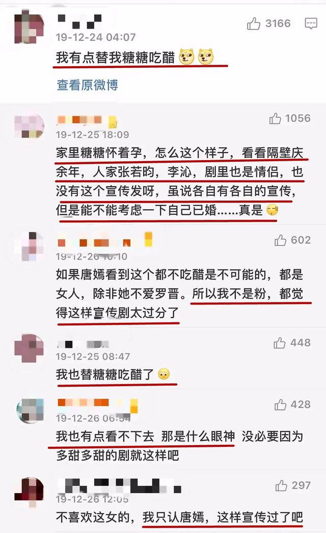 新剧宣传视频下的评论区里,连路人都看不下去,表示罗晋在组cp宣传新戏的时候,唐嫣还在家里怀着孕,真的心疼唐嫣,隔壁《庆余年》剧组的张若昀、李沁也饰演情侣,却从来没有过这种宣传,罗晋能不能考虑一下自己已婚的身份,这样宣传剧的方法真的太过分!