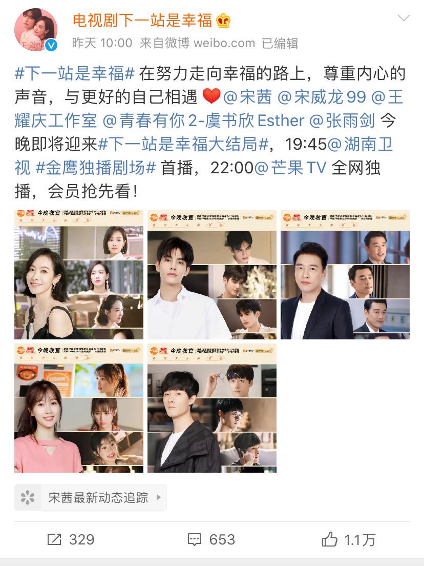 这组好报是《下一站是幸福》微博账号昨天发出的,并不是芒果台发的,应该与播出平台没有关系,是剧方所为。