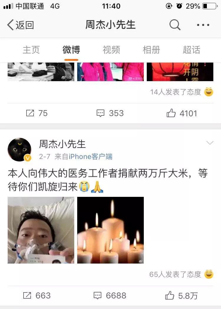 2月7号的时候,周杰官宣为医务工作者捐2万斤大米,掺杂在为李文亮医生祈福的情绪中。