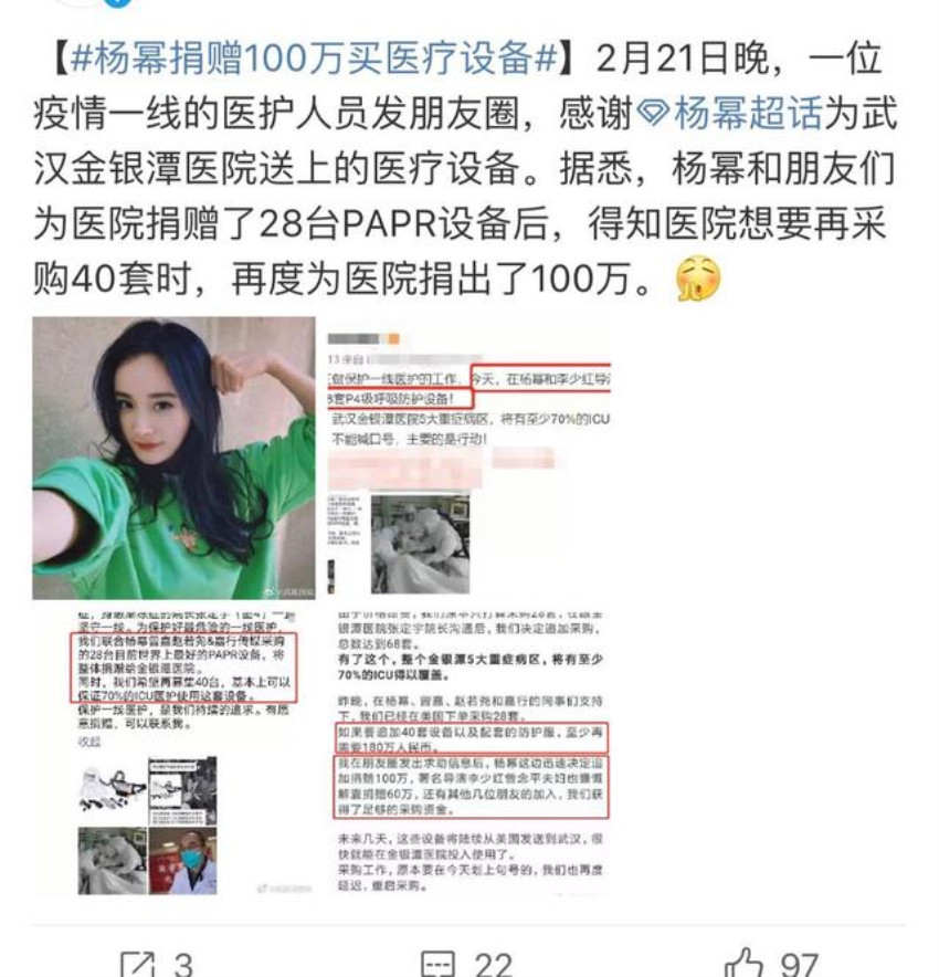 结果微博的评论区网友分成了两派,一是"孙俪邓超被骂铁公鸡""你们夫妻俩太恶心了""孙俪一集片酬八十万,捐款却只捐30万,太抠门!",另一派则是"喷子们你们见过30万吗?""不要道德绑架,捐多捐少都是心意"。网友们为了夫妻俩也是操碎了心,你们怎么看?与此同时,另一位艺人也是因为捐款事件喜登微博热搜,不过是与娘娘和邓超夫妻俩截然相反,就是在演技上一直饱受争议的杨幂了。杨幂与好友为金银潭医院捐赠了28台PAPR设备,得知医院想要再采购40套时,杨幂再度追加100万捐款。网友们纷纷表示"她没有赢过一次网络暴力,也没缺过一次民族大义""杨幂前前后后一直在捐款捐物资,名副其实的'杨立娟'"。
