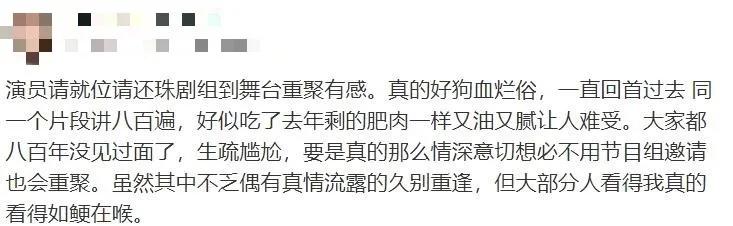 不过有观众因回忆杀激动落泪,但也有观众觉得太尴尬了,《还珠》剧组重聚的噱头都用了多少次了,更希望节目组不要再消费情怀。