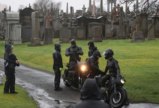 时光网讯 前不久导演 公开了 版 试妆视频,但犹抱琵琶半遮面,而且色调还极其暗,观众无法看清完整造型。近日剧组在苏格兰格拉斯哥大墓地取景,蝙蝠侠完整造型被拍到。