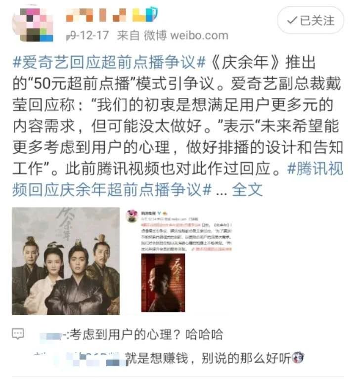 想当初《庆余年》超前点播的时候可是招来了不少争议,网友们纷纷抵制用户在开了VIP的基础上还要额外付费的追剧模式。一石激起千层浪,人民日报发文批评视频网站吃相难看,最后视频网站的高层不得不亲自站出来回应争议。