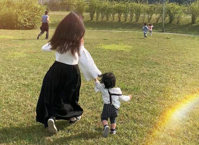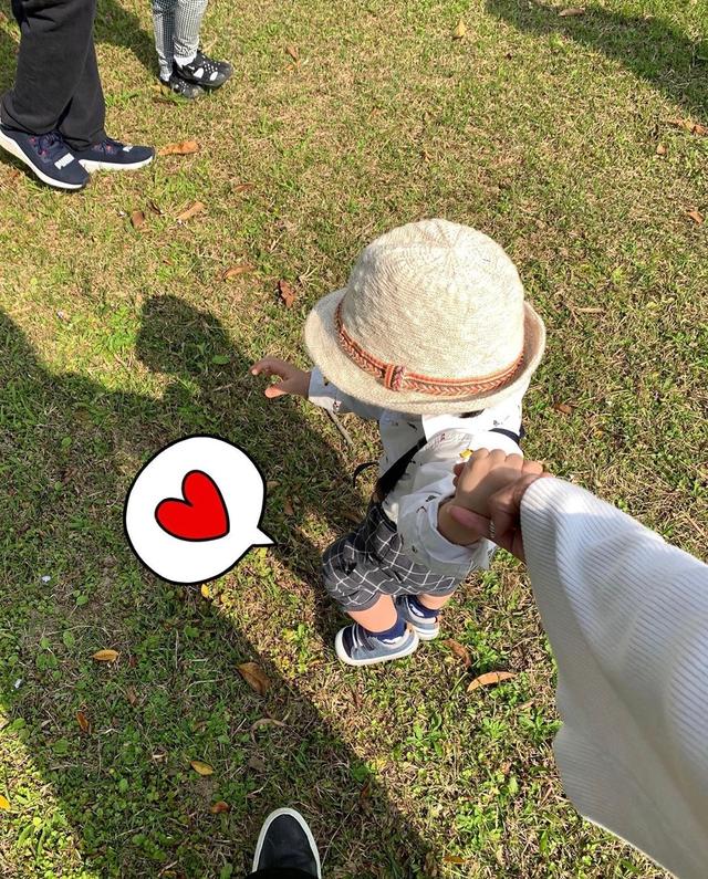 戴着圆毡帽的嘉耀就更萌了,牵着妈妈的手走在草地上,这种对妈妈的依赖,流露出来的情感是对妈妈满满的爱!没有正脸出镜,但是也非常温暖!