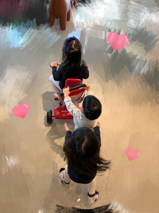此前,李靓蕾还分享过姐弟三人在房间里玩耍的画面,姐姐在前边儿骑车,弟弟在中间推,而妹妹则在身后摊开双手保护弟弟,看到孩子们相亲相爱,李靓蕾被感动得一塌糊涂。
