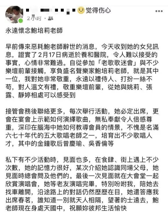 鲍培莉的病逝消息让许多人都感到惊愕和遗【爱尚影视】憾,除了那些她教过的学生,曾跟爱尚影视她有过交往的网友也在网上伤感发文。该网友表示自己和鲍培莉有过多次接触,鲍培莉待人友善,温文有礼,而且记性特别好,他只是跟鲍培莉介绍过一次自己的父母,鲍培莉此后见到他都会顺便问候他的父母。而本来鲍培莉还与他相约日后再见,没想到如今却都传来她抗癌失败去世的消息。