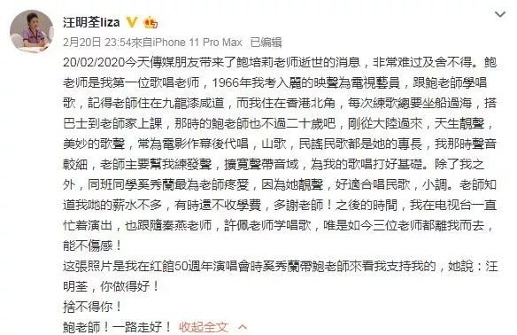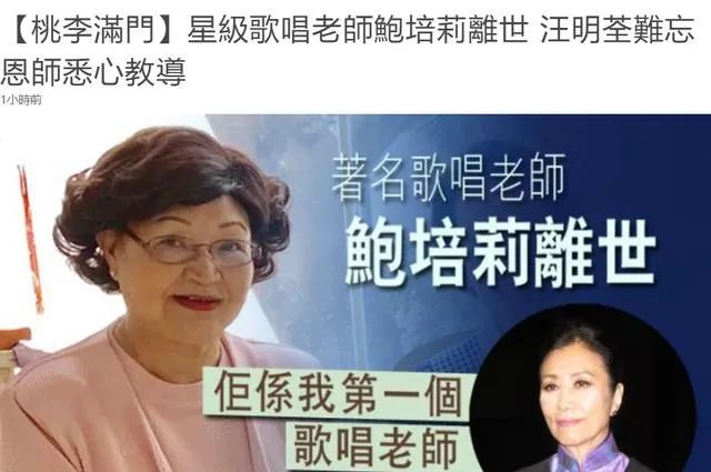 鲍培莉去世消息传出后,阿姐汪明荃也在社交平台发文悼念,原来,鲍培莉早年也是汪明荃的音乐老师!汪明荃在微博晒出自己和鲍培莉及奚秀兰的三人合照,当时汪明荃在红馆举办演唱会,奚秀兰就带着鲍培莉老师去观看,演唱会结束后鲍培莉还赞汪明荃唱得好。
