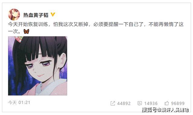 2月20日,黄子韬在微博晒出一张日本动漫中的少女角色照片并配文:“今天开始恢复训练,怕我这次又断掉,必须要提醒一下自己了,不能再懒惰了这一次。”很多明星在家里吃了睡,睡了吃,胖了很多,黄子韬也不例外,所以他现在要开始训练了。