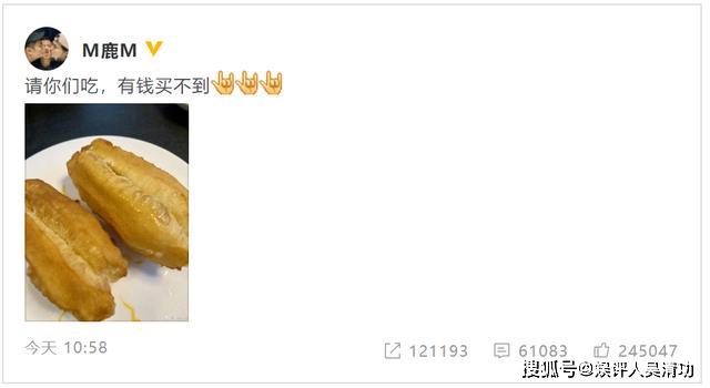 王一博云录制《天天向上》的时候,还和天天兄弟一起表演了“不放弃”的手势舞,真是正能量满满。2月20日,鹿晗在微博晒出一张油条的照片并配文:“请你们吃,有钱买不到。”