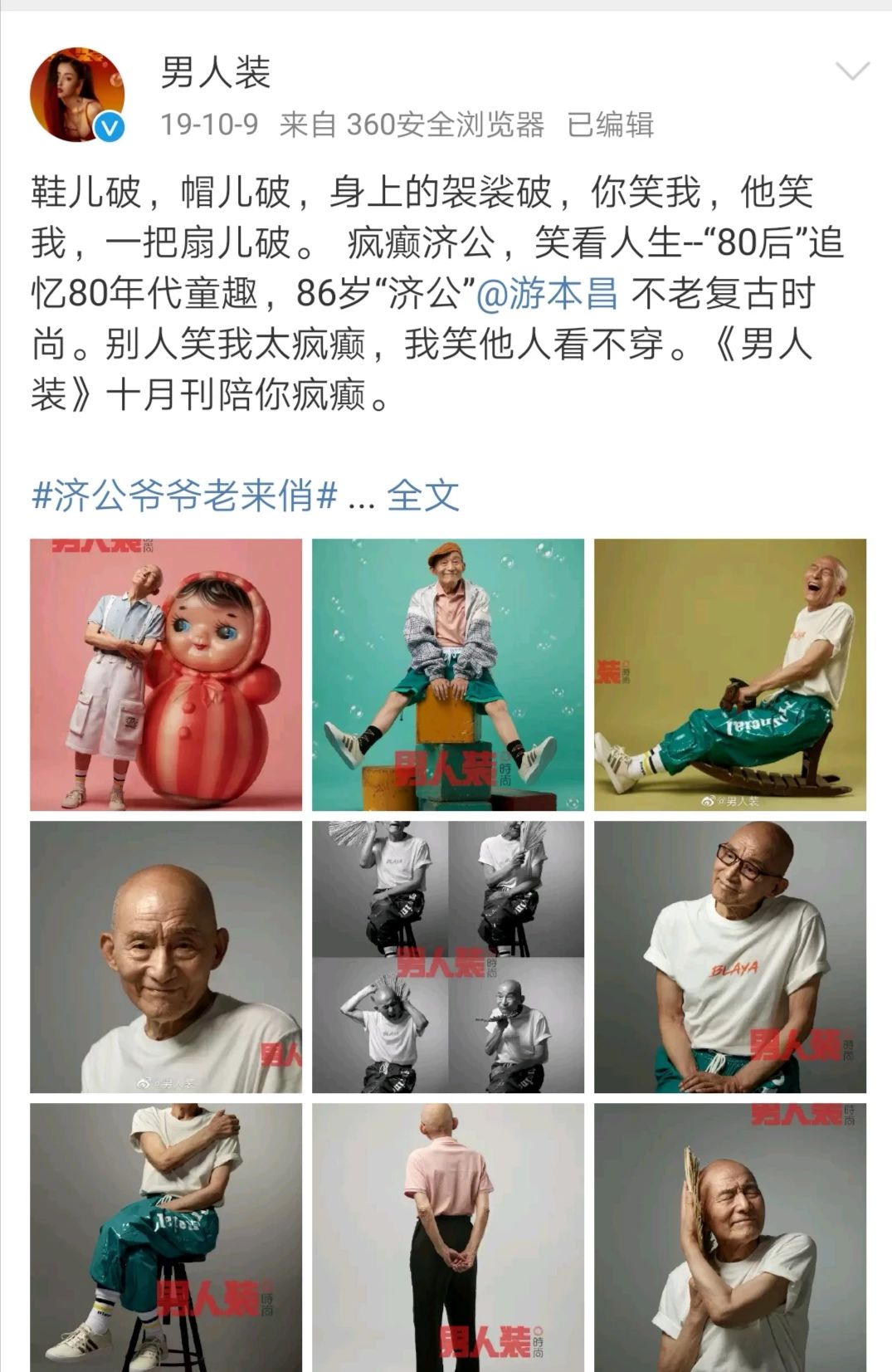 《男人装》官微发文晒出了老爷子拍摄的九宫格图片,称:"别人笑我太疯癫,我笑他人看不穿,《男人装》十月刊陪你疯癫"。