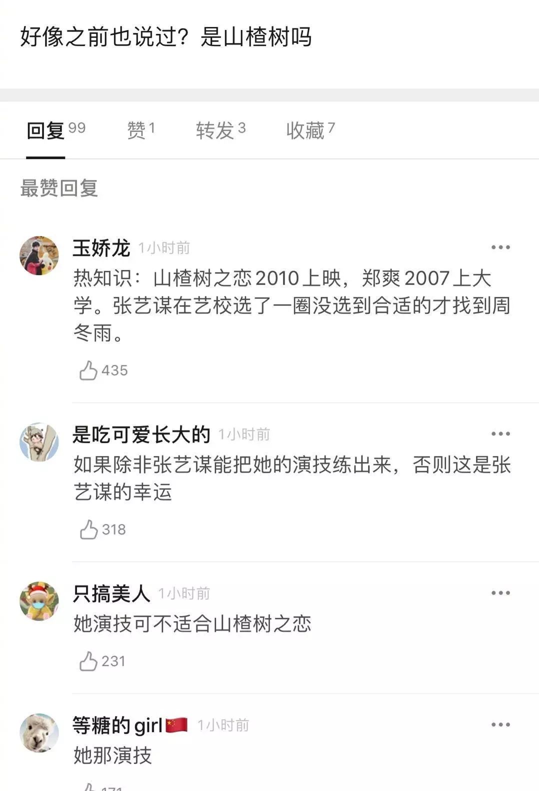 此话一出,网友才不关心辞演张艺谋这回事呢,大家就想知道,郑爽辞演的是张艺谋的哪部戏。