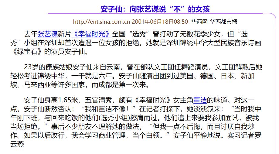 说起这个《幸福时光》啊,不止杨蓉一个人“拒演”,还有一个素人叫“安子仙”的,也理直气壮的拒绝了张艺谋。
