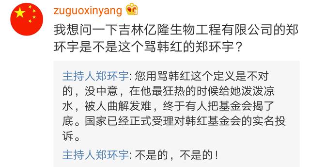 随即,有网友问到:“我想问一下吉林亿隆生物工程有限公司的郑环宇是不是这个骂韩红的郑环宇?”对此,郑环宇回答道:“不是的,不是的!您用骂韩红这个定义在线电影院是不对的,没中意,在他最狂热的时候给她泼泼凉水,被人曲解发难,终于有人把基金会揭了底。国家已经正式受理对韩红基金会的实名投诉。”